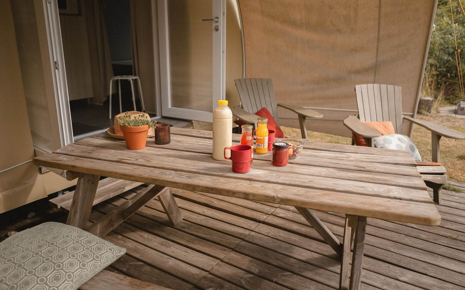Glamping in een moderne tent gemaakt van kokosnoothout